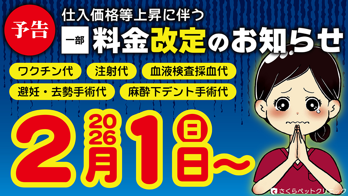 | 主な改定内容 | ワクチン猫4種/犬6種,注射料金,血液検査採血料金,避妊・去勢手術,麻酔下デント手術,他 |