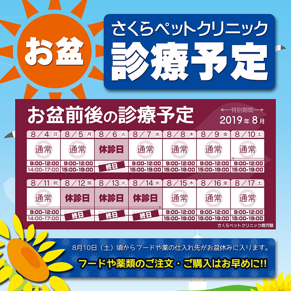 当院の2019年《お盆前後の診療予定》を公開させていただきます。